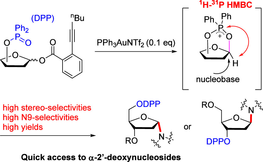 2'-脱氧核苷即通常所说的脱氧核苷,不仅是DNA的重要组成部分,而且在药物研发中也有着重要的地位。但是2'-脱氧核苷及其类似物的立体选择性合成在糖化学中是一个挑战,现有的方法存在产率低、立体选择性差以及底物适用范围窄等不足,阻碍了相关的药物研发和生产。此外,以往的研究基本都是针对具备天然β构型的β-2'-脱氧核苷;而其非天然的异构体α-2'-脱氧核苷则缺乏有效的获得途径,并未引起足够的重视。本论文研究者在前期工作的基础上(Angew. Chem., Int. Ed. 2022, 61, e202206128; Chin. J. Chem. 2022, 40, 443),利用廉价商品化试剂在2-脱氧核糖上引入二苯基次膦酰基(diphenylphosphinoyl, DPP)基团,可以分别实现α-和β-2'-脱氧核苷的高立体选择性合成,尤其适合α-2'-脱氧核苷的快速制备。