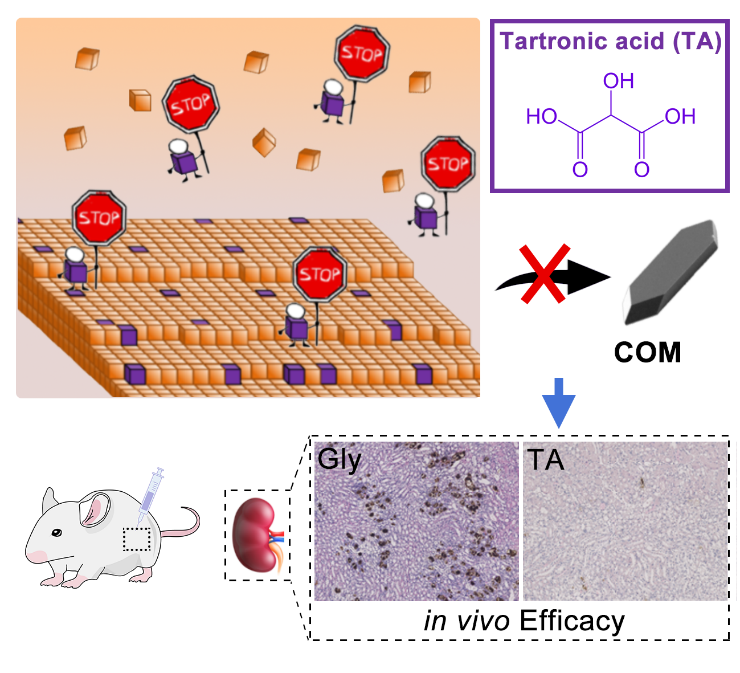 肾结石是一类重要的公共卫生问题,由肾脏内异常结晶引起,具有发病率高、复发率高的特点。该团队致力于通过干预结晶过程发现肾结石新的治疗策略。研究团队通过建立实验+计算的体外筛选平台,发现了羟基丙二酸通过特异性分子间相互作用结合在草酸钙晶体表面抑制草酸钙晶体生长。体内研究显示羟基丙二酸能够显著减少高草酸尿小鼠肾脏草酸钙沉积、降低血清尿素氮、肌酐水平、下调肾损伤标志物NGAL、MCP-1和OPN的表达,具有良好的体内抗结石和肾脏保护作用。该研究显示了羟基丙二酸具有防治肾结石的潜力,证实了以晶体作为肾结石药物开发靶标的可行性,也为其他结晶性疾病的治疗提供了新的思路。