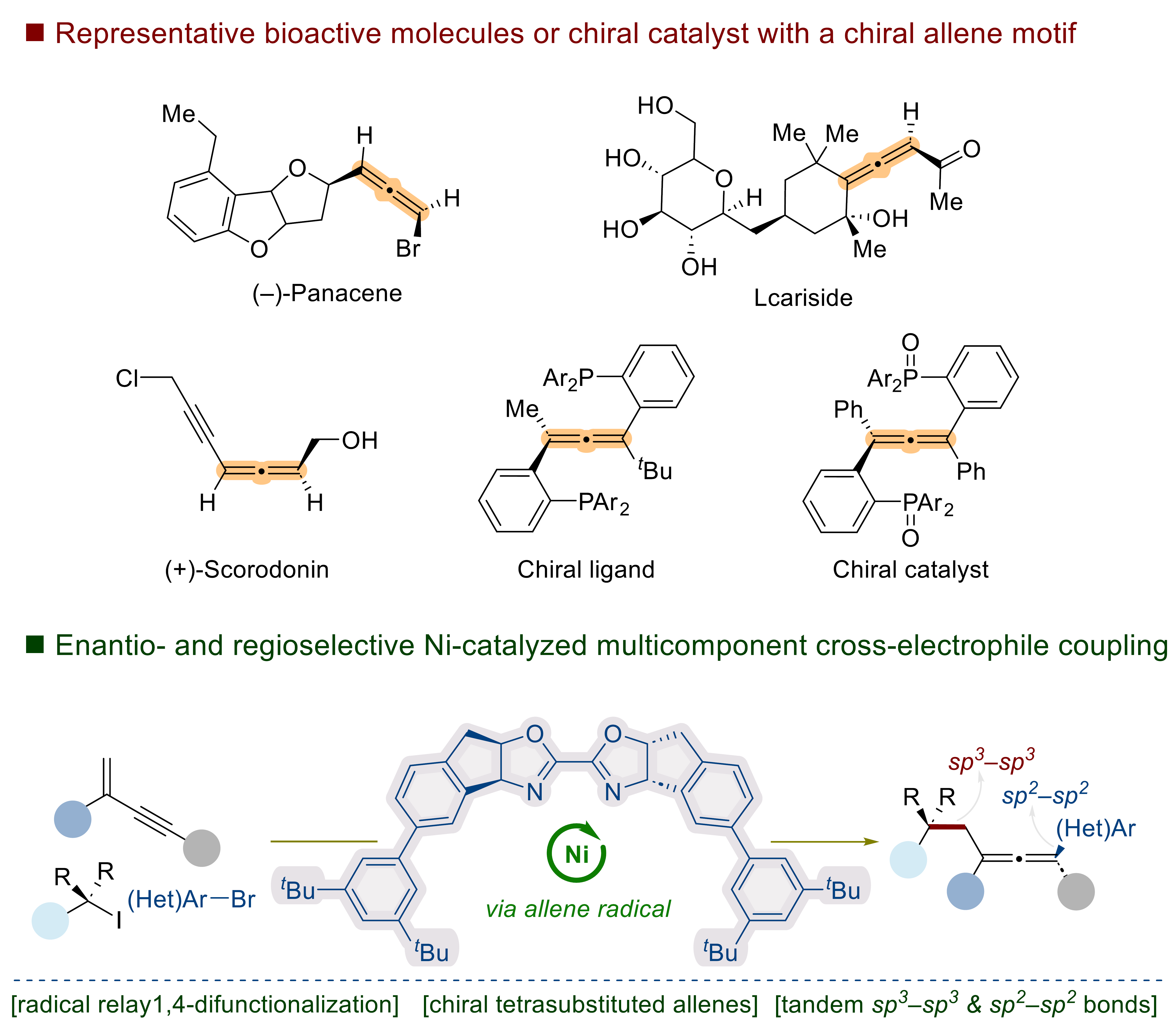 手性联烯作为药理活性分子和天然产物中的关键结构单元,在现代有机合成和生物活性分子设计中扮演着至关重要的角色,一直是化学研究的热点领域。尽管如此,通过自由基途径合成手性四取代联烯化合物仍然是一个充满挑战的工作。本研究团队长期专注于开发金属催化的不对称偶联反应,旨在建立构建具有重要生物活性分子骨架的新策略。近期,团队基于前期工作基础以及对廉价金属催化的自由基不对称偶联反应的深入研究,开发了一种新型手性配体,成功实现了镍催化未活化烷基碘、1,3-烯炔和芳基溴之间的区域和立体选择性C(sp3)-C(sp3)及C(sp2)-C(sp2)的串联自由基交叉偶联反应。该方法不仅条件温和,而且具有广泛的底物适用性,为从简单原料高效合成手性四取代联烯化合物开辟了新的途径。随后进行的自由基捕获、自由基钟和动力学实验等机理研究表明,该反应通过自由基接力偶联的机制进行,且镍催化剂与芳基卤化物的氧化加成过程是反应的决速步骤。
