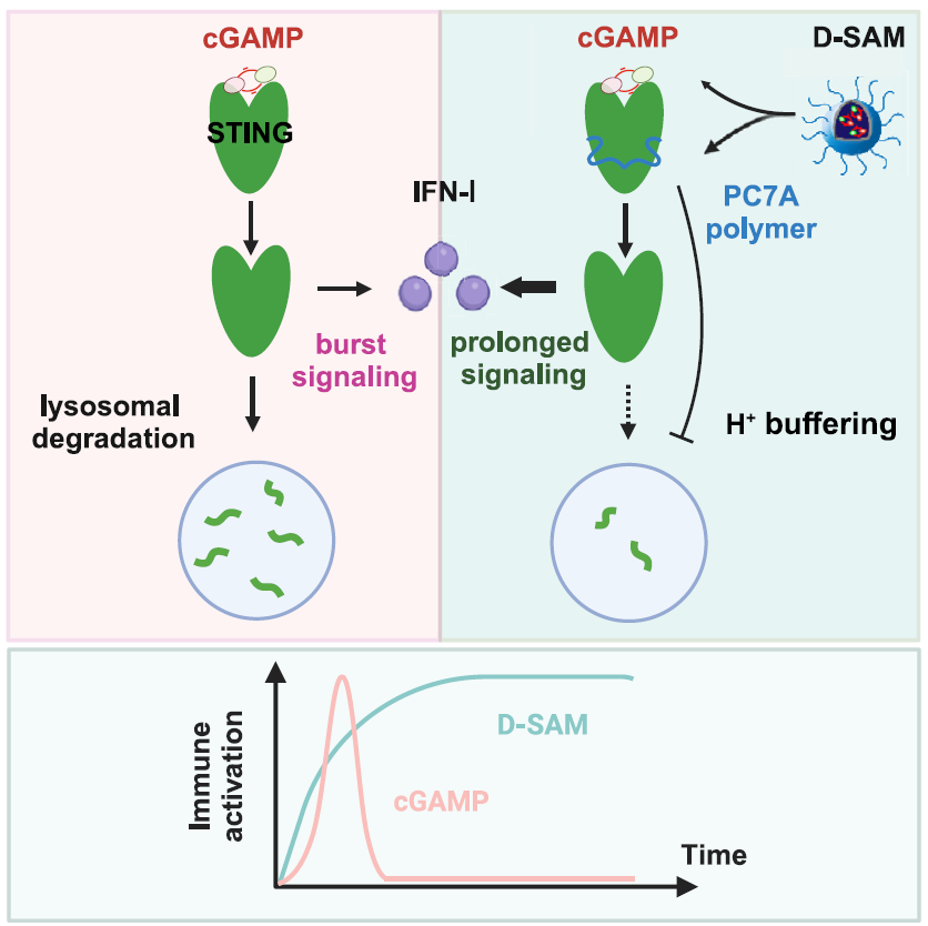 该研究设计了一款具有双重STING激活能力的纳米胶束制剂D-SAM,通过调控STING胞内转运与降解过程,延长下游免疫信号活化时间,放大抗肿瘤免疫疗效。其中小分子激动剂迅速激活STING,同时借助高分子载体的质子海绵效应抑制活化的STING蛋白被溶酶体降解,持续提供STING激活信号。该“刺激-锁定”模式显著促进DC的抗原交叉呈递,有效延长效应T细胞的活化与浸润时间,同时避免了T细胞的耗竭与凋亡。在结直肠癌、黑色素瘤、乳腺癌等小鼠模型中表现出显著的抑瘤效率,并能防止肿瘤的复发与转移。进一步利用肿瘤病人组织样本,考察了临床转化的适配性。