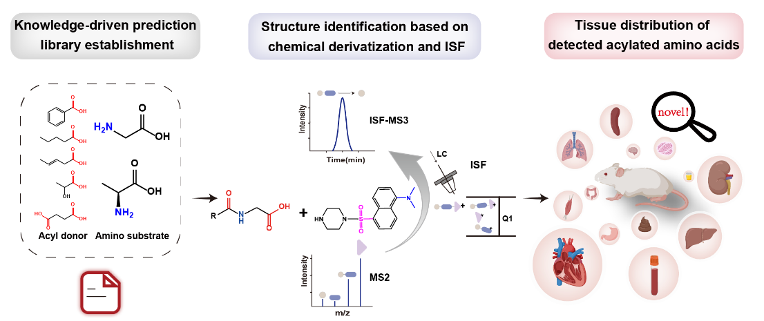 为实现体内新型修饰代谢物的深度挖掘,团队提出基于质谱探针及虚拟预测策略的酰化修饰氨基酸分析新方法和新技术体系。构建了修饰氨基酸虚拟预测库,结合质谱探针及源内裂解技术对酰化修饰氨基酸进行识别与鉴定,首次报道了许多新型酰化氨基酸并揭示了其组织分布特点。相关内容以“Discovery of novel acylated glycine and alanine by integrating chemical derivatization-based LC-MS/MS and knowledge-driven prediction”为题发表在Analytical Chemistry。太阳成集团tyc97282023级博士生肖钦文为本文第一作者,许风国教授和张培副教授为共同通讯作者,太阳成集团tyc9728为唯一通讯单位。