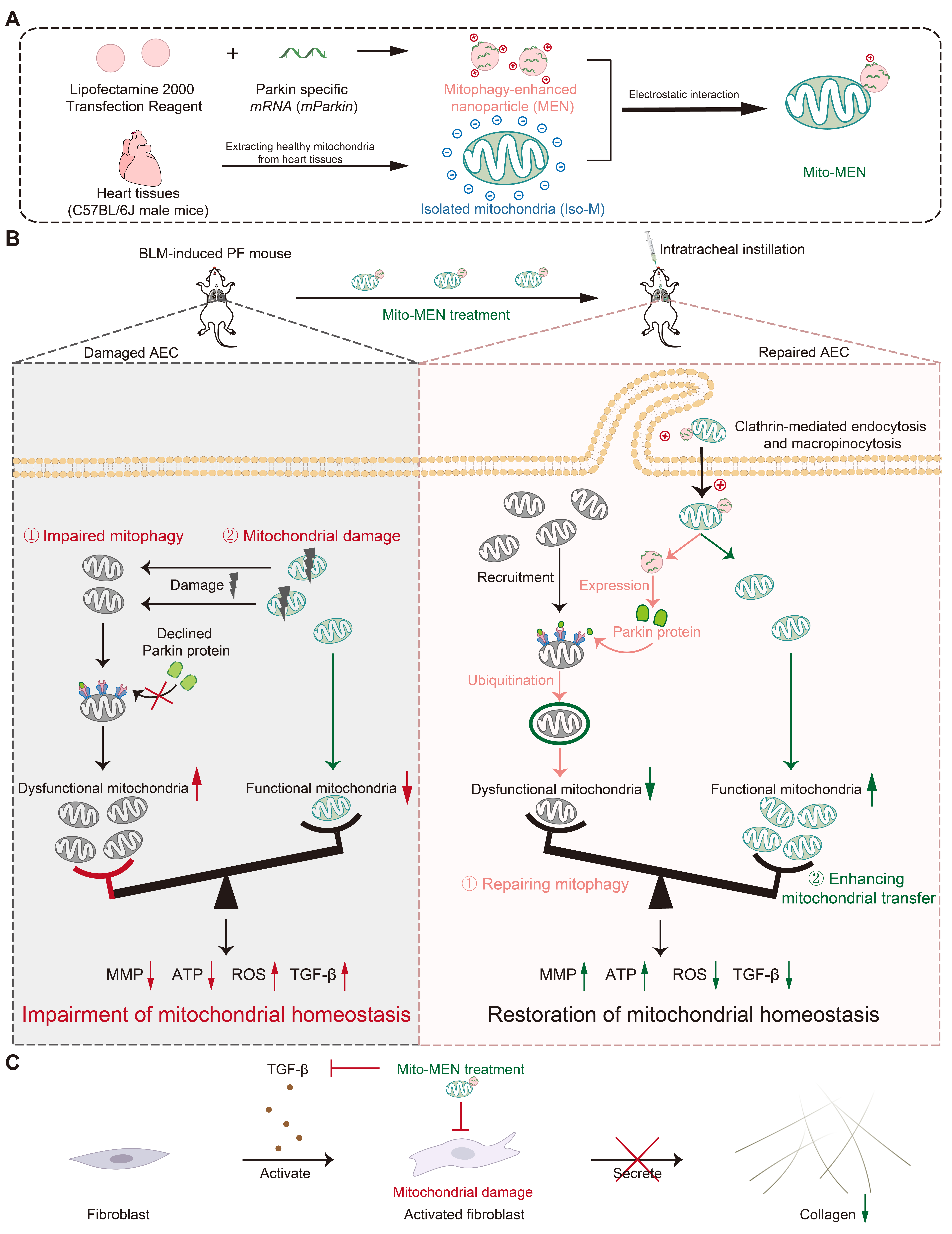 肺纤维化(Pulmonary fibrosis,PF)是一种进行性且致命的间质性肺部疾病,与肺泡上皮细胞线粒体稳态失衡密切相关,该疾病也是典型的继发性线粒体疾病。线粒体移植可通过递送外源性线粒体恢复线粒体功能。然而在PF病理状态下,由于线粒体自噬受损,功能障碍的线粒体无法得到有效清除,这影响了线粒体稳态调控的效果。该研究团队构建了一种线粒体自噬增强型纳米粒修饰的工程化线粒体,一方面通过提高线粒体递送效率增加细胞内健康线粒体的比例;另一方面通过促进功能失调线粒体自噬降解降低受损线粒体的比例,共同调节线粒体稳态。在博来霉素诱导的PF小鼠模型中,工程化线粒体有效修复线粒体功能,并缓解PF症状。相关工作以“Mitophagy-enhanced nanoparticle-engineered mitochondria restore homeostasis of mitochondrial pool for alleviating pulmonary fibrosis”为题发表在ACS Nano上。太阳成集团tyc9728副研究员王译、硕士毕业生胡力凡、博士生刘娜辉为共同第一作者,公司姜虎林教授和东南大学医公司中大医院李玲教授为本文共同通讯作者。