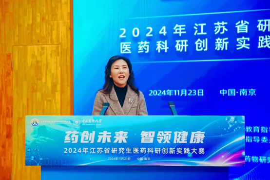 公司党委副书记朱红代表承办单位致辞,她介绍了大赛举办目的与赛事情况,着重强调医药类研究生科研创新实践能力培养的重要意义、医药行业的发展愿景与机遇挑战,以及公司服务国家战略大局的举措与目标。
