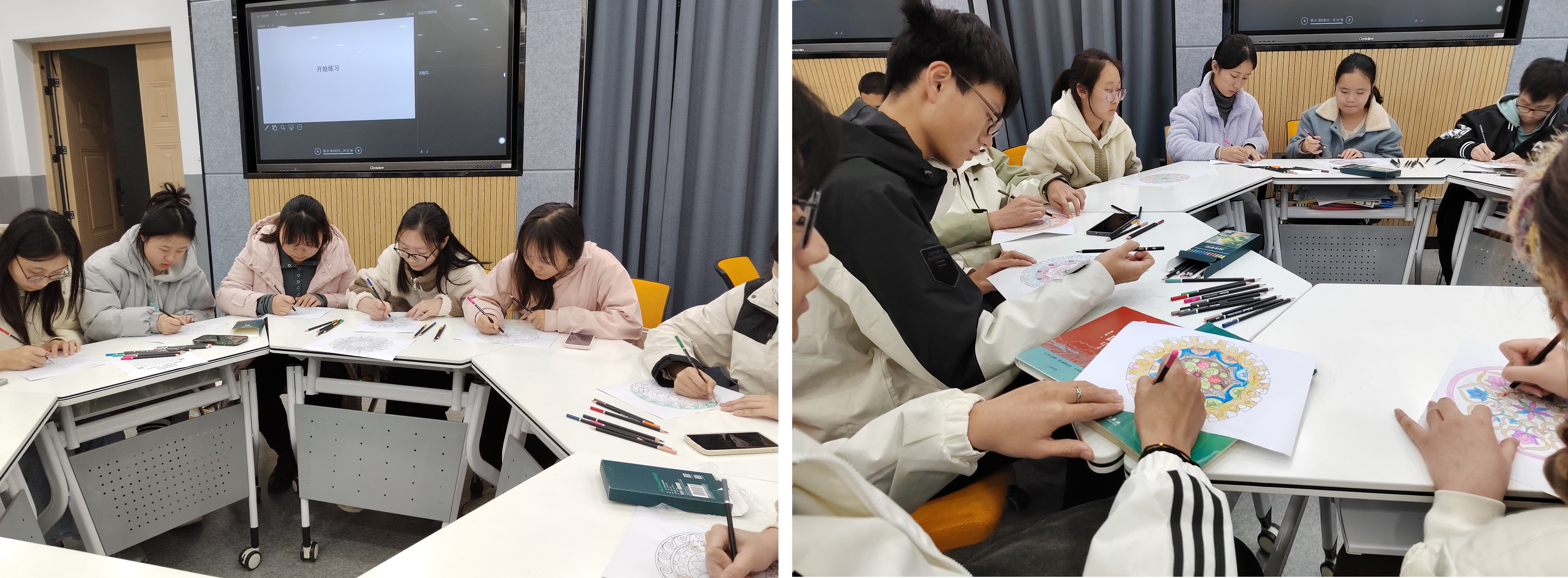 绘画创作环节,同学们沉浸于内心探索,手持画笔,在曼陀罗图案内自由挥洒色彩、填充线条,或专注于色彩搭配,用鲜明色调表达内心的热情与活力;或精心勾勒线条,以细腻笔触描绘出内心的宁静与秩序。分享交流阶段,同学们敞开心扉,讲述画作背后的故事与情感,纷纷表示绘画过程将内心的焦虑驱散,形成平和向上的积极心态。