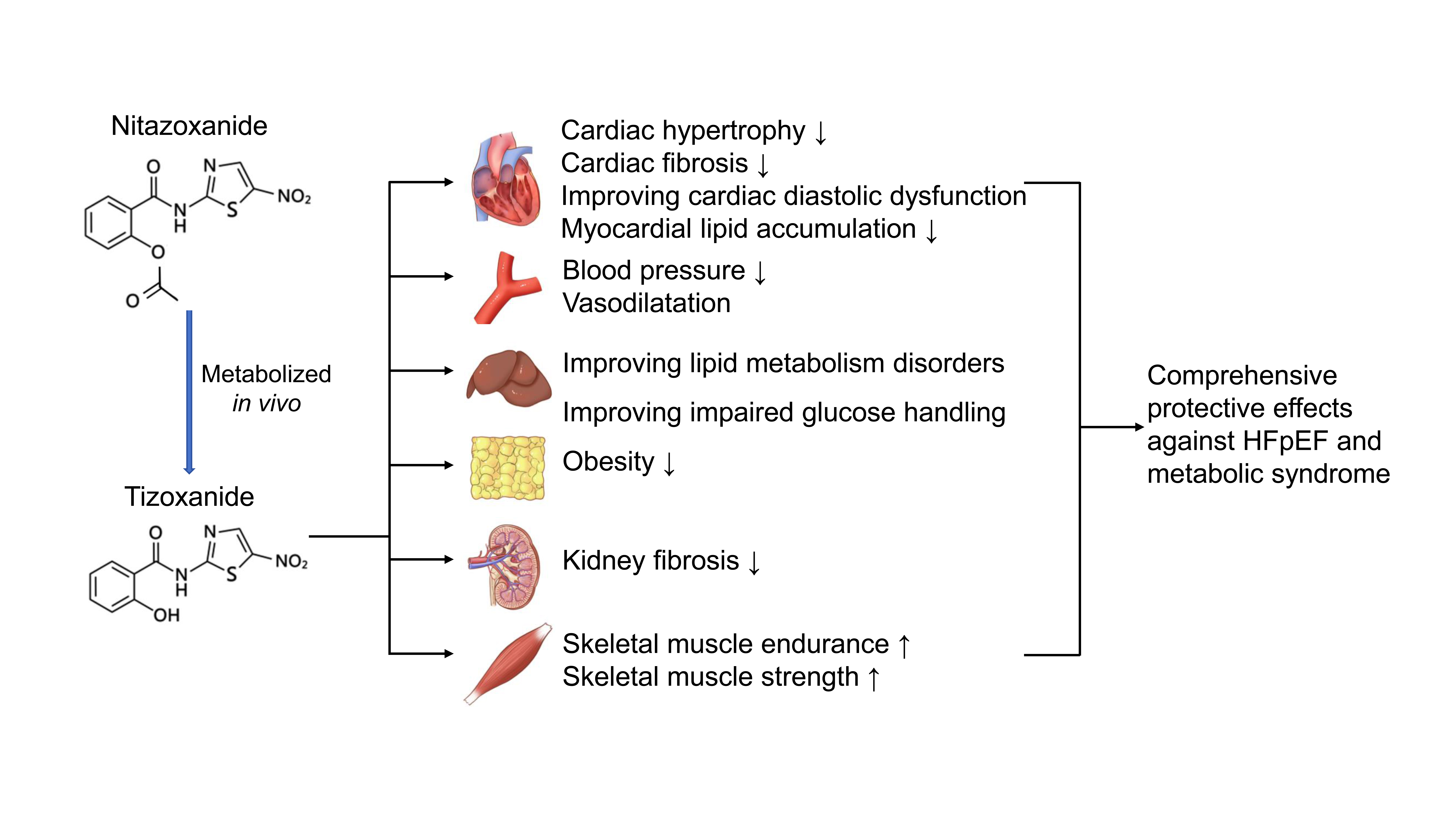 基于以上发现,该团队采用高脂饮食饲养联合L-NAME“双打击”建立小鼠HFpEF模型,研究硝唑尼特对HFpEF的影响。发现口服途径给予硝唑尼特可显著抑制高脂饲养联合L-NAME诱导的HFpEF小鼠心肌肥厚、心脏纤维化、心脏舒张功能障碍、心脏脂蓄积、血压升高、运动耐力受损、肝脏脂肪样变、肾纤维化和主动脉收缩功能减退等;在已建立的HFpEF小鼠模型中,治疗性给予硝唑尼特同样可以改善高脂饮食联合L-NAME诱导的小鼠心肌肥厚、心脏纤维化、心脏舒张功能障碍和肝脏脂肪样变等。本研究提示硝唑尼特有望成为治疗HFpEF及相关代谢综合征的潜在药物。