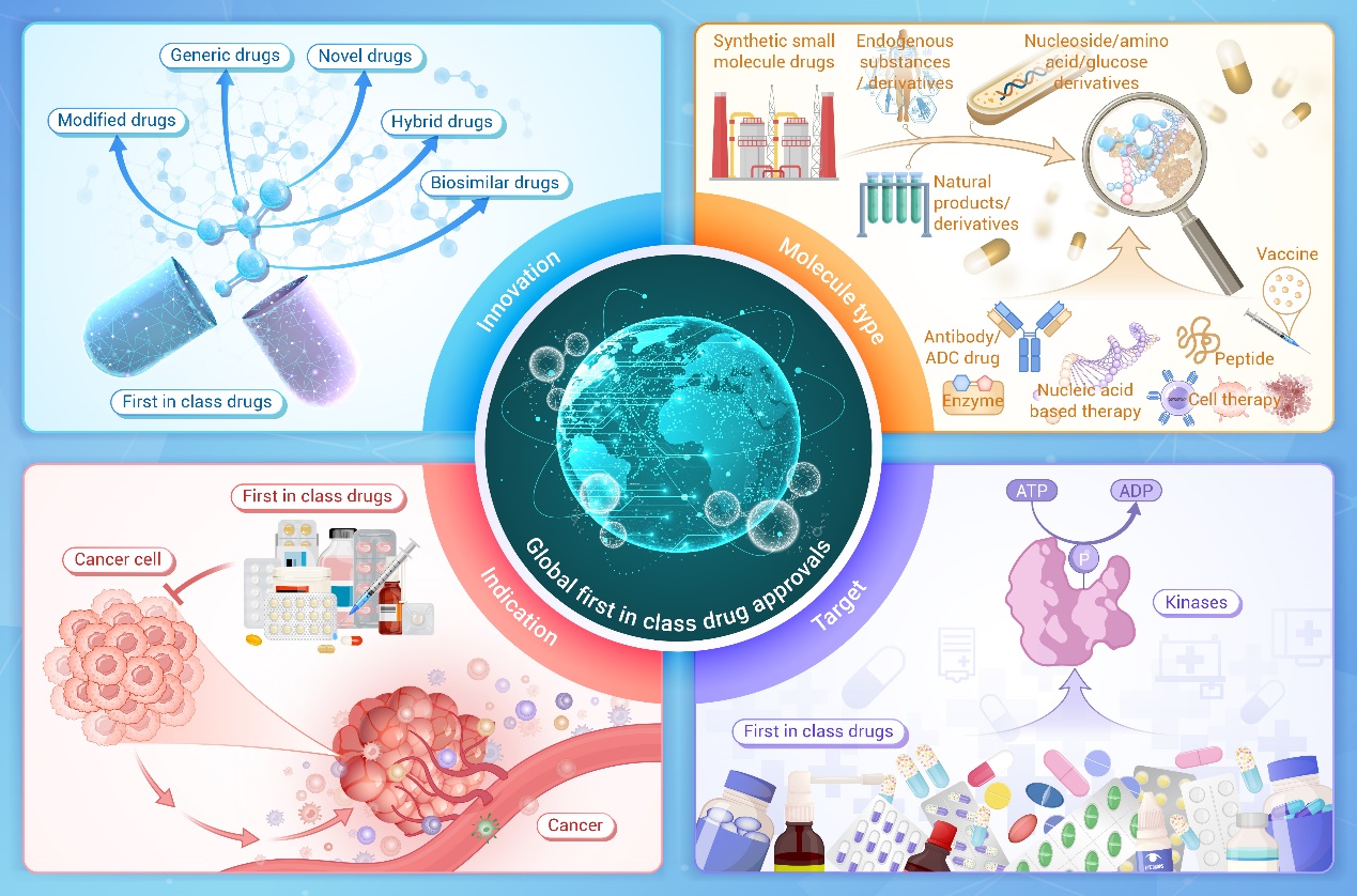 近日,公司太阳成集团tyc9728王磊/尤启冬团队在知名学术期刊The Innovation(IF: 33.2)上在线发表了题为“Global first-in-class drugs approved in 2023-2024: Breakthroughs and insights” 的综述文章,阐述了2023-2024年间全球首创性小分子药物的突破与进展。太阳成集团tyc97282024级直博生翟代超、副教授张秋月为本文的共同第一作者;太阳成集团tyc9728药物化学系王磊研究员、尤启冬教授,海军军医大学基础医公司卢小玲教授为本文共同通讯作者;太阳成集团tyc9728为本论文的第一通讯单位。