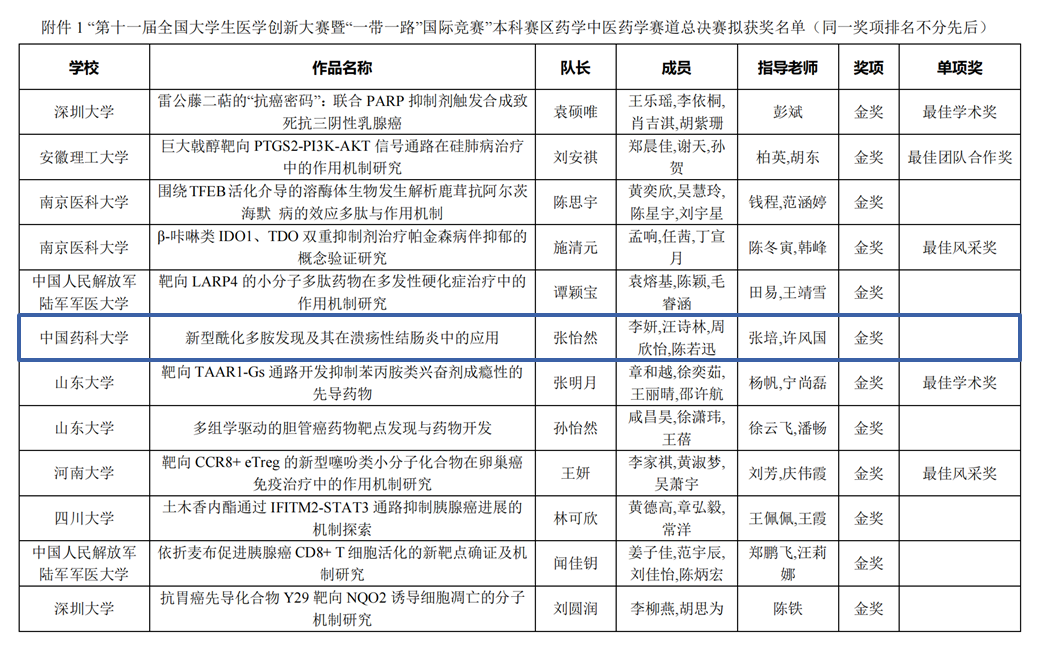 近日,第十一届全国老员工医学创新大赛暨2025“一带一路”国际竞赛全国总决赛在山东大学圆满落幕,由来自太阳成集团tyc9728、基础医学与临床药学公司本科生组成的公司代表队(成员:张怡然、李妍、汪诗林、周欣怡、陈若迅,指导教师:张培、许风国)表现优异,参赛项目《新型酰化多胺发现及其在溃疡性结肠炎中的应用》荣获药学中医药学赛道全国总决赛金奖。