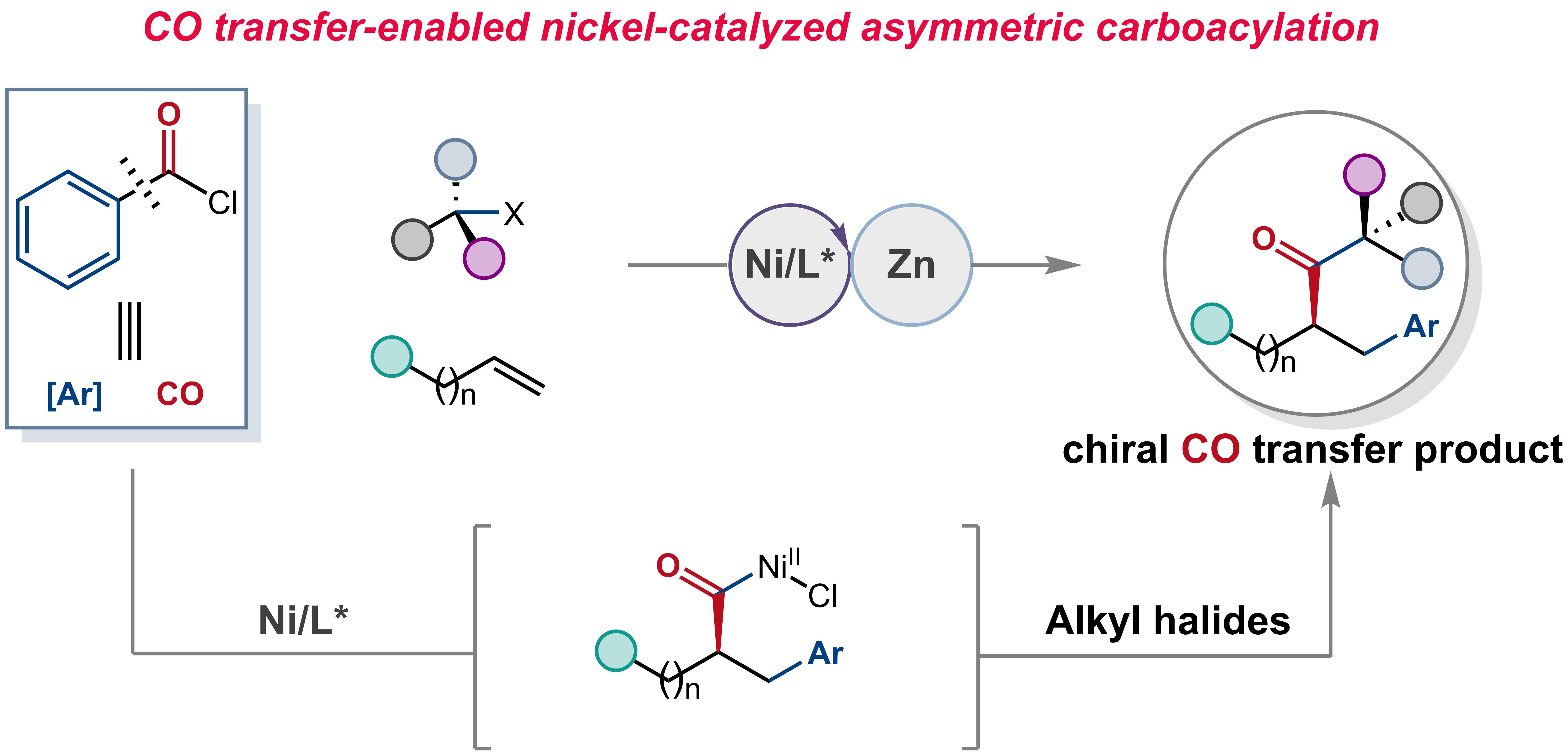 针对上述挑战,研究团队基于“官能团转移(Functional Group Transfer)”理念,创新性地利用酰氯同时作为“碳源”和“羰基源”,在镍催化体系下实现了烯烃的不对称碳酰化反应。通过对CO“释放—再插入”过程的精确动力学调控,成功实现了区域选择性与对映选择性的协同控制,在无需外加CO气体的条件下,高效合成了一系列手性酮类化合物。