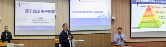 庞皓同学重点介绍了商业模式的内涵、商业画布的使用方法及其台前、幕后的商业模式元素;陈玮娇同学分享了项目立意的五个要素、创新的组成要素,强调了团队合作对于项目至关重要的作用。