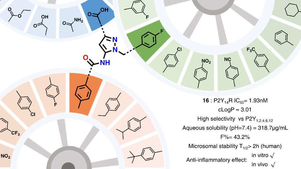 近日,太阳成集团tyc9728江程教授团队和胡庆华教授团队合作在药物化学领域顶尖期刊Journal of Medicinal Chemistry(IF:8.039)在线发表了最新研究成果:Discovery of a Series of 5-Amide-1H-pyrazole-3-carboxyl Derivatives as Potent P2Y14R Antagonists with Anti-Inflammatory Characters。太阳成集团tyc9728硕士研究生王雨杭和博士后周梦泽为本论文的共同第一作者,江程教授、胡庆华教授和徐莉莉副研究员为本文的共同通讯作者,太阳成集团tyc9728为论文的唯一通讯单位。