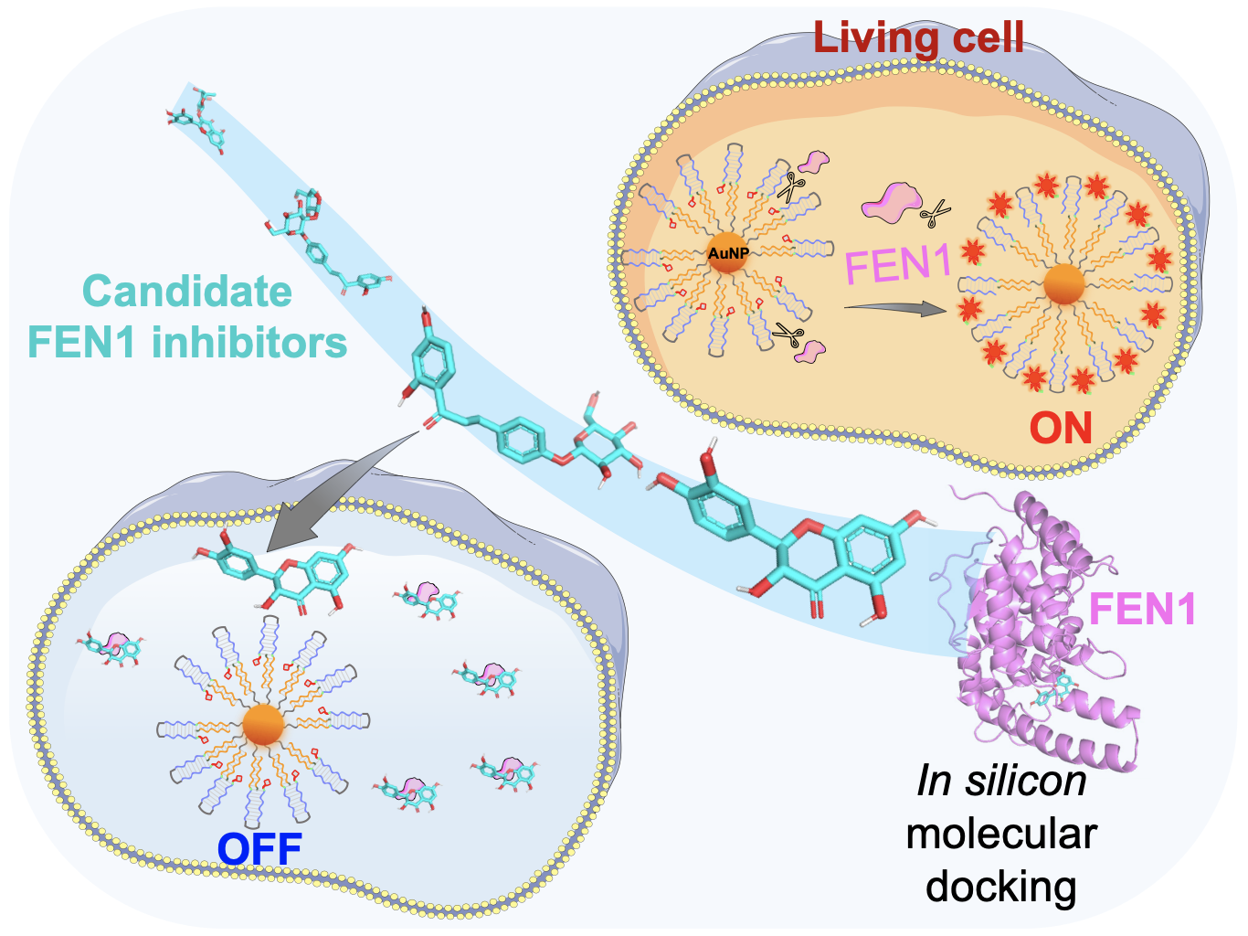 Flap核酸内切酶1(FEN1)是近年来报道的一种肿瘤标志物。该研究构建了一种DNA荧光传感器,可特异性响应活细胞中FEN1的活性变化,非常适合于FEN1抑制剂筛选,为针对该靶点的化合物活性评价提供了一种有力的分析手段。该团队一直围绕FEN1开展生物分析新方法研究,近两年在药物分析学科顶尖杂志Analytical Chemistry上连续发表六篇相关研究论文(Anal. Chem. 2021, 93, 9593-9601、Anal. Chem. 2021, 93, 5529-5536、Anal. Chem. 2022, 94, 14725-14733、Anal. Chem. 2022, 94, 8633-8641、Anal. Chem. 2022, 94, 3858-3864、Anal. Chem. 2023, 95, 8621-8631)。