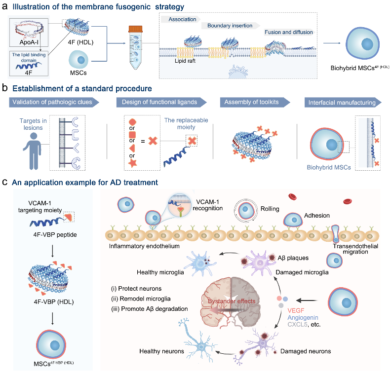 间充质干细胞疗法近年取得突破性临床进展,尤其对阿尔茨海默症(AD)等神经退行性疾病治疗具有极好的应用前景,但病灶非特异性迁移仍是其疗效不佳的关键问题。基于上述间充质干细胞治疗难点,受内源活性微粒盘状高密度脂蛋白(HDL)生物合成和生理功能启发,本研究创新性提出:通过HDL桥接干细胞膜表面脂筏,完成间充质干细胞膜表面高效无损病灶靶向归巢修饰,构建膜杂化间充质干细胞传递系统,实现了间充质干细胞在AD动物模型中血脑屏障渗透、病灶富集、长效存活和旁观者效应等神经修复治疗优势。此外,本研究深入解析间充质干细胞AD治疗机制,发现入脑间充质干细胞可通过激活神经系统发育及神经炎症抑制等相关信号通路,实现AD脑内神经重塑。本研究设计的仿生膜修饰技术具有高效、稳定、温和等优势,为开发个性化活细胞药物输送平台提供了新思路和新方案。