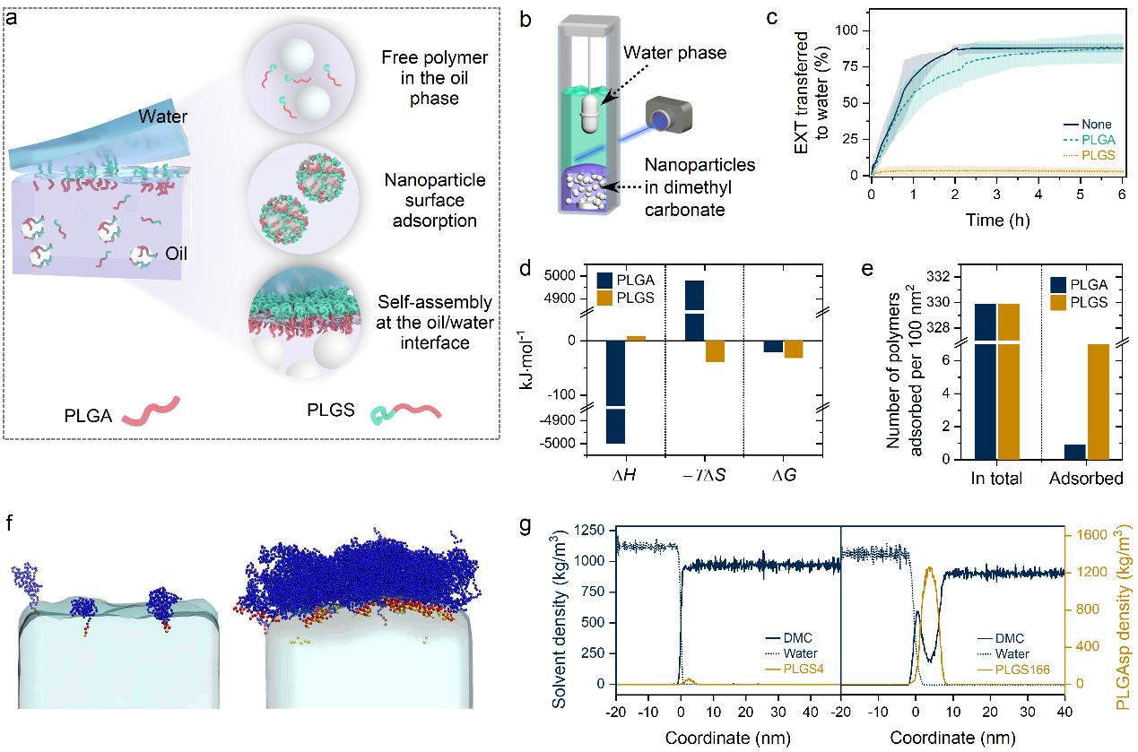 该团队运用石英晶体微天平、自主研发的药物跨界面扩散实时监测装置等实验手段,结合全原子和粗粒化的分子动力学模拟,对两亲性聚合物抑制药物胶体颗粒相转移的作用机制进行了多层次分析。研究结果显示,具有高表面活性的两亲性聚合物不仅能在药物胶体颗粒表面形成稳定的吸附层,还能快速在油水界面自组装成致密的界面膜。这两种由聚合物形成的界面结构共同阻挡了药物胶体颗粒接近油水界面,从而有效抑制了其相转移过程。通过对两亲性聚合物在整个体系中分布状态的分析,确认了游离状态是两亲性聚合物在油相中的主要存在形式。这一机制在不同种类的聚合物材料及药物组成中都展现出了较高的通用性。该研究为我们理解两亲性聚合物如何实现多肽蛋白类药物的高效包载提供了一个更为全面和深刻的视角。